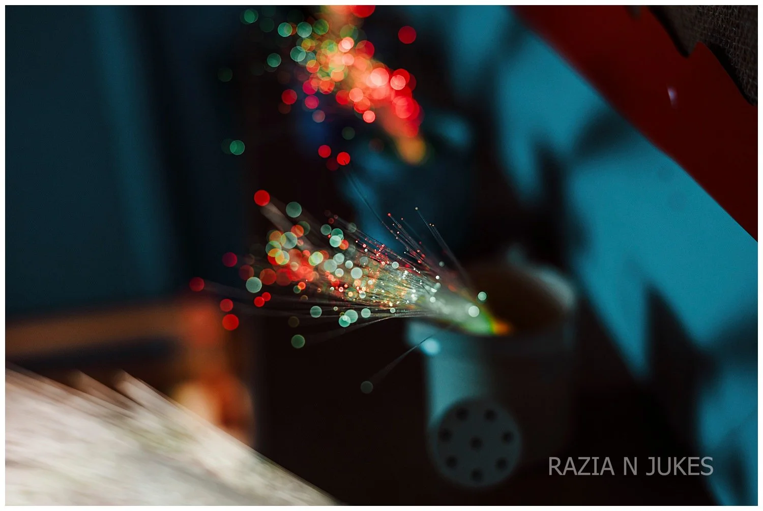 Close-up of a fiber optic light with colorful, blurred light bokeh effect in the background.