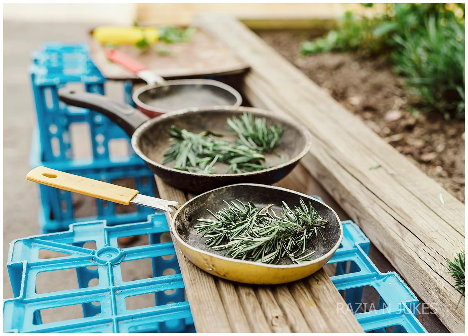 Two young boys playing with water in a backyard, one holding a sand shovel, and the other holding a toy ax, near a small table with water, with a blurred house and an adult in the background.